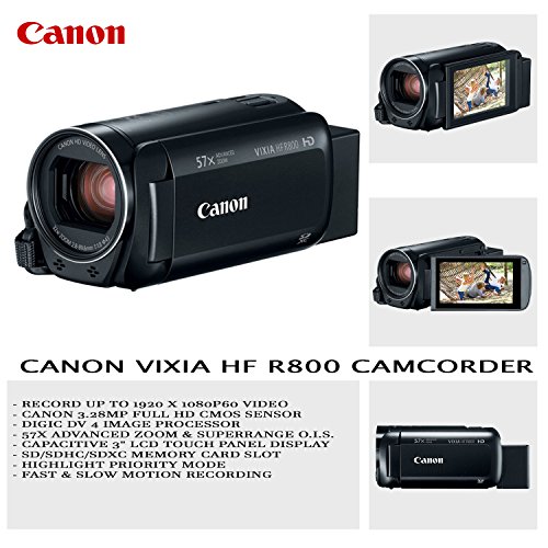 - Canon VIXIA HF R800 Camcorder (Black) - Record up to 1920 x 1080p60 Video, Canon 3.28MP Full HD CMOS Sensor, DIGIC DV 4 Image Processor, 57x Advanced Zoom & SuperRange O.I.S., Capacitive 3" LCD Touch Panel Display, SD/SDHC/SDXC Memory Card Slot, Highlight Priority Mode, Fast & Slow Motion Recording.